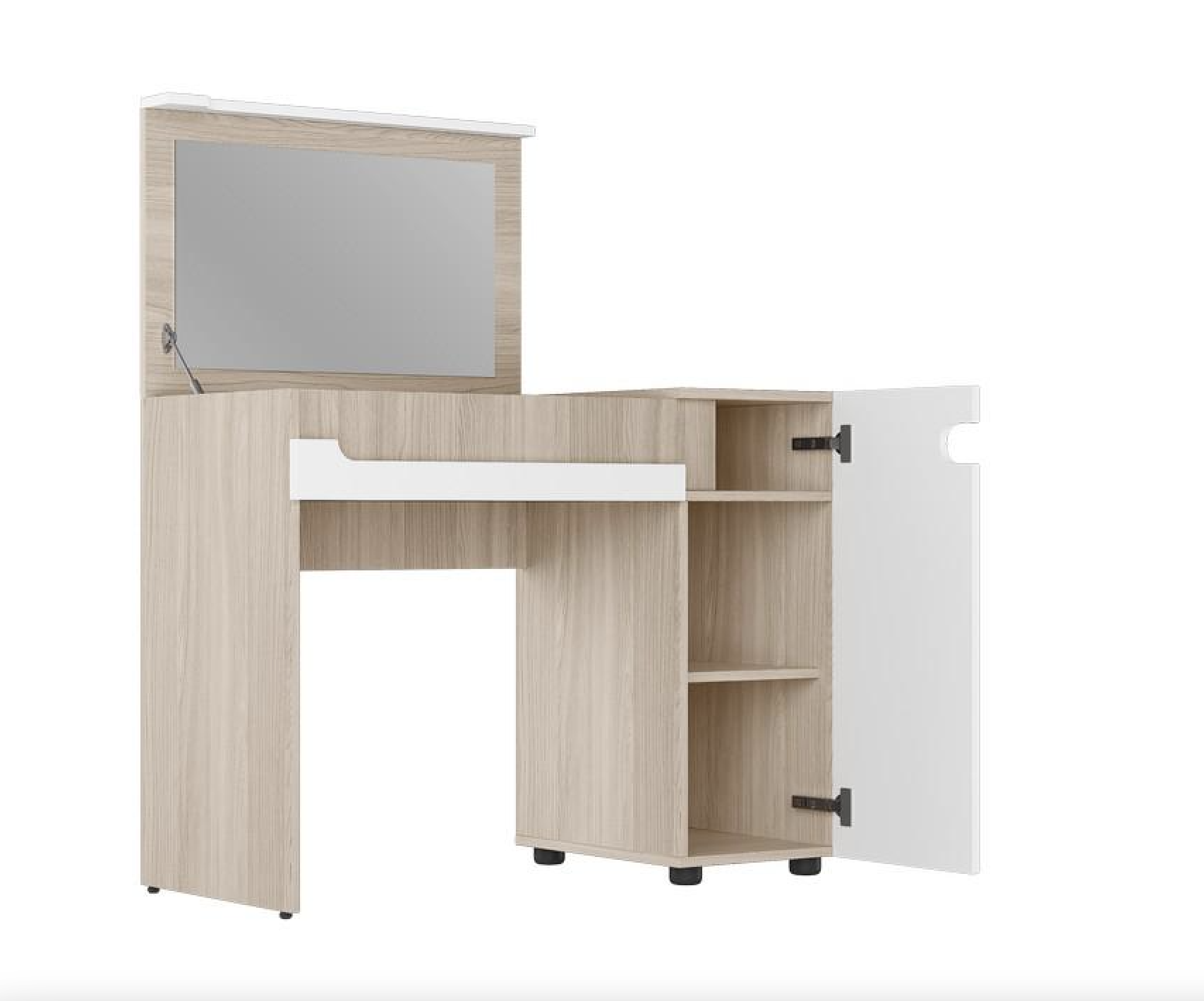 • Столик с откидной крышкой оснащен секцией с отделениями для хранения с зеркалом, и секцией с полками